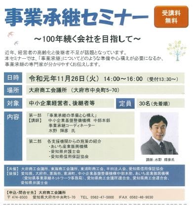西尾商工会議所、大府商工会議所で開催される愛知県信用保証協会主催の事業承継セミナー