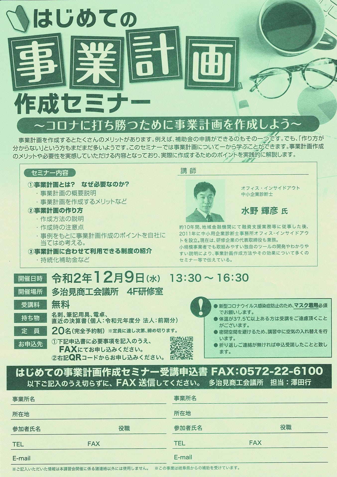 投稿日: 2020年11月16日 投稿者: office-insideoutはじめての事業計画作成セミナー多治見商工会議所にてはじめての「事業計画」作成セミナーを開催します。補助金申請などまだしたことがない方も、事業計画の作成は必須となっています。3時間で事業計画の必要性や作成方法などが学べます。お近くの方はぜひご参加ください!