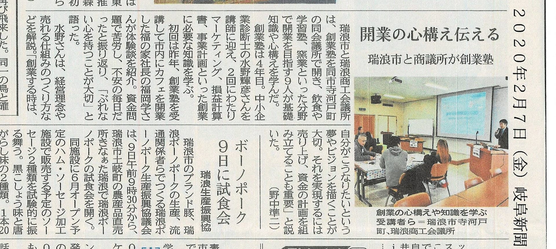 2月1日に実施した、瑞浪市創業セミナー1日目を岐阜新聞に取り上げて頂きました。